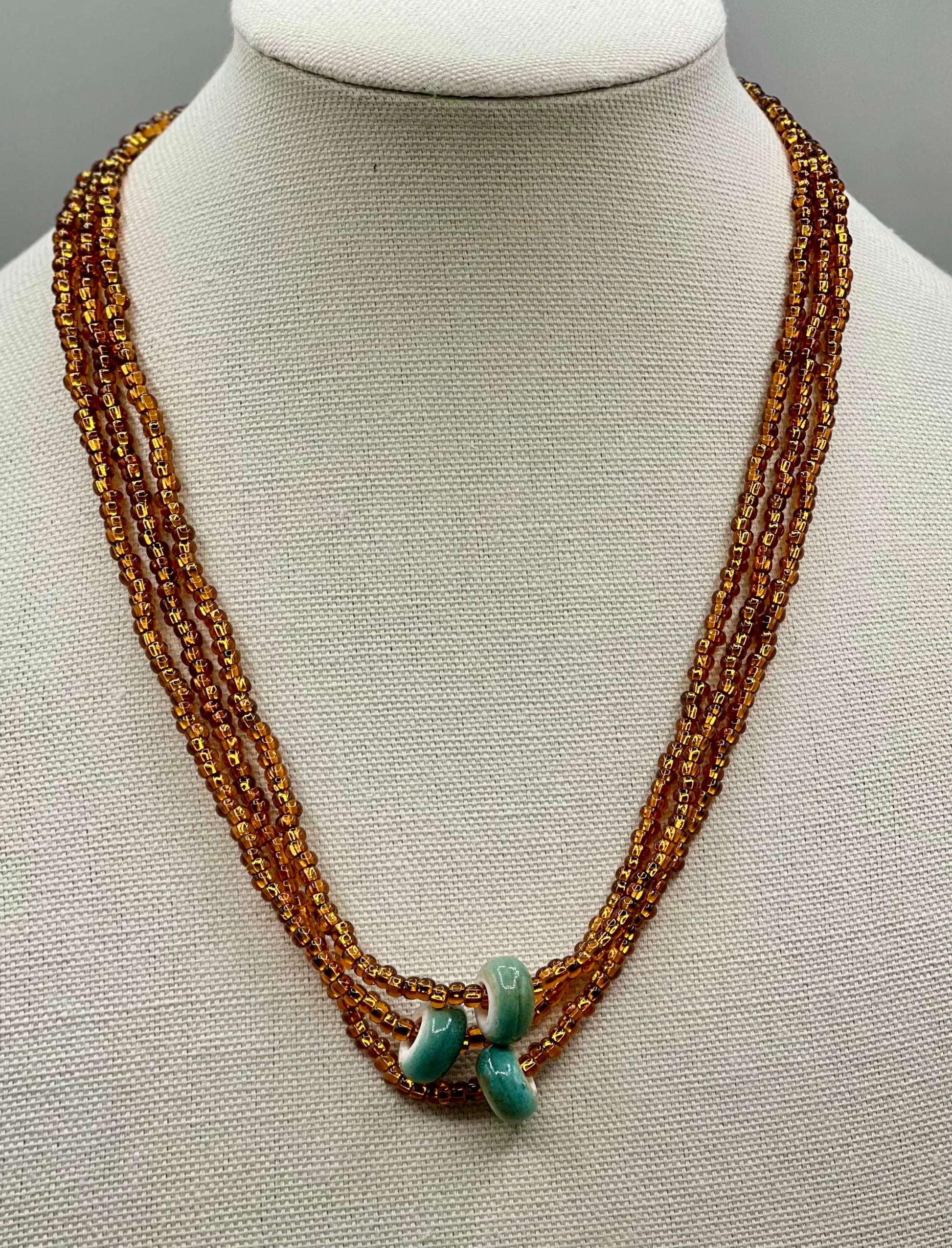 This simple, standout necklace is 24 inches and is made of silver-lined topaz Czech glass seed beads and is embellished with floating, aqua ceramic rondelle beads. All necklace closures are composed of a combination of lobster clasp and jump bead findings made with varying combinations of nickel-free zinc alloy, stainless steel, and 925 sterling.
