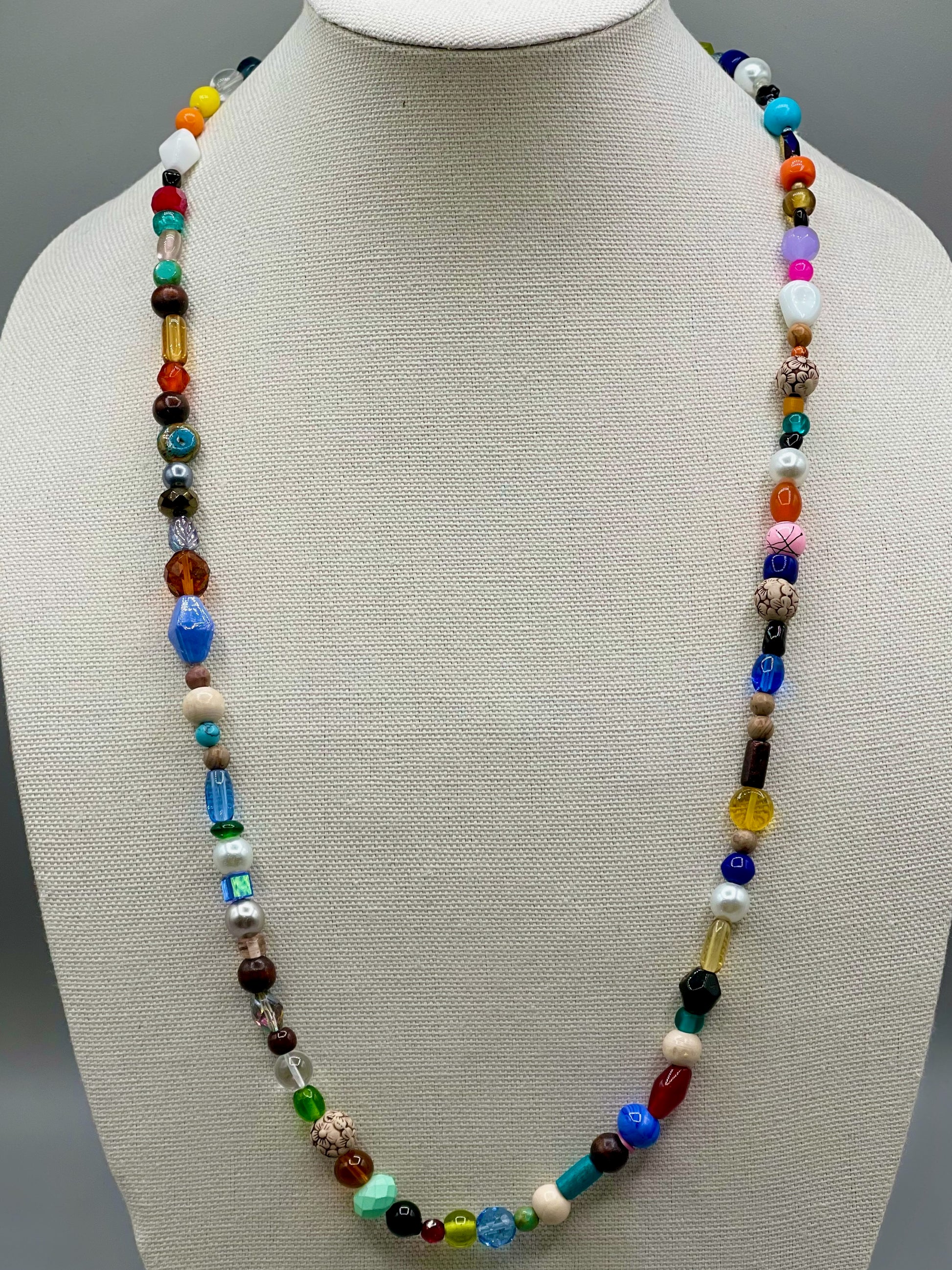 This 35-inch necklace is made of multicolor mixed glass, stone, and ceramic beads. All necklace closures are composed of a combination of lobster clasp and jump bead findings made with varying combinations of nickel-free zinc alloy, stainless steel, and 925 sterling.
