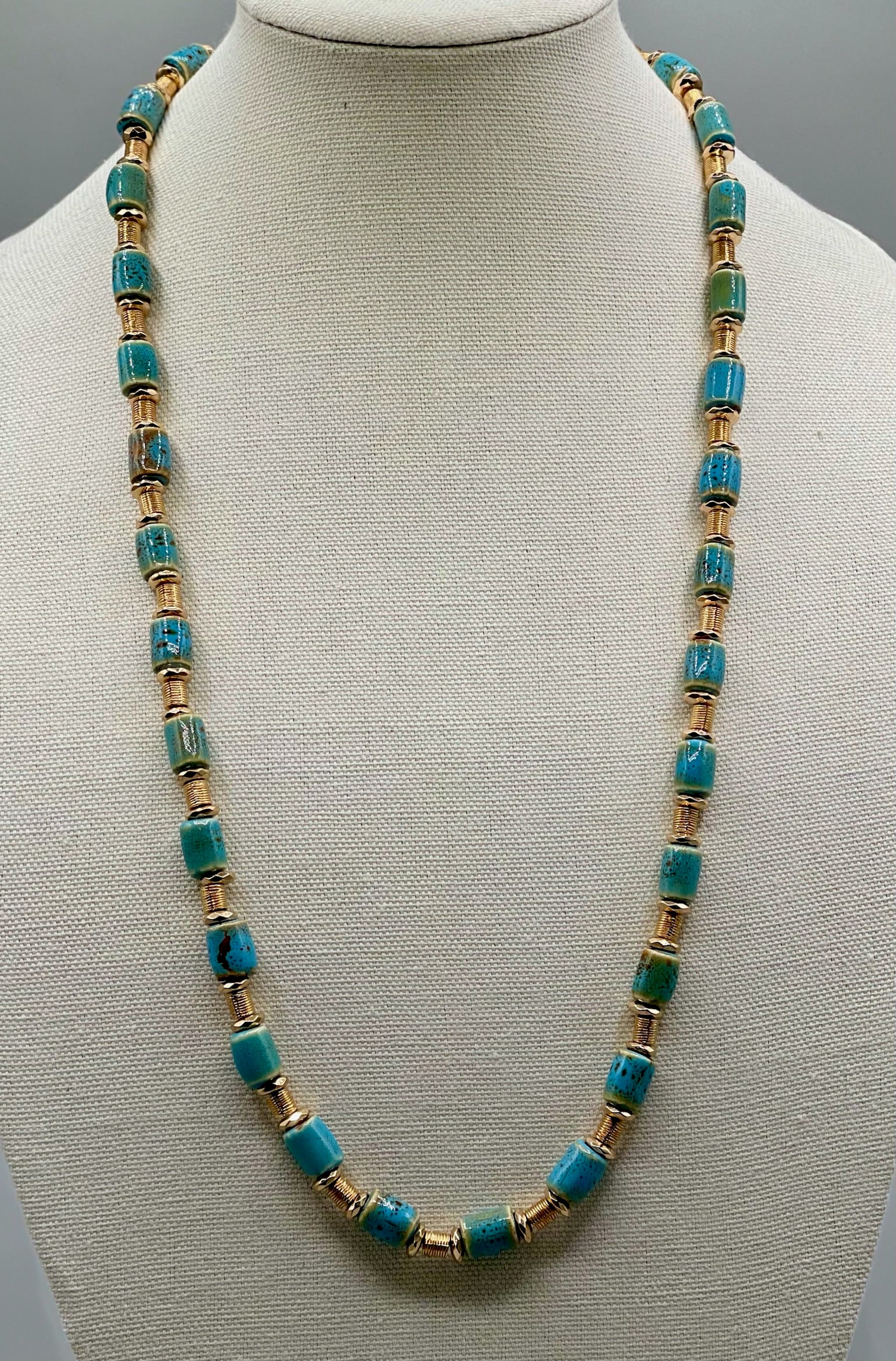 This 32-inch necklace is made of blue and tan ceramic tube beads spaced with gold hematite faceted lentil beads and metal tube beads. All necklace closures are composed of a combination of lobster clasp and jump bead findings made with varying combinations of nickel-free zinc alloy, stainless steel, and 925 sterling.