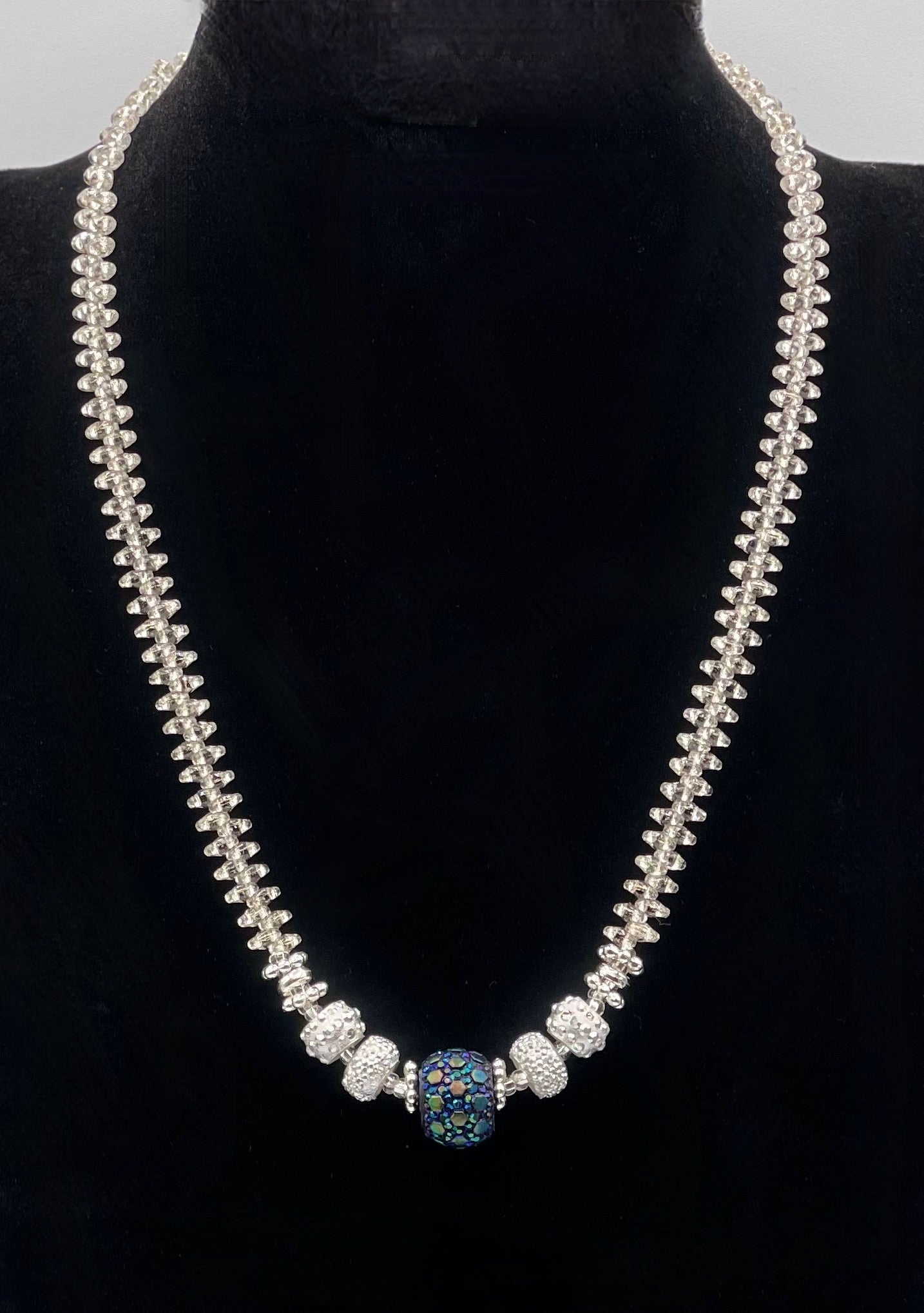 This 18-inch necklace is made of silver-lined transparent crystal Czech teardrop seed beads draped with silver polymer rondelle beads and a large midnight blue rondelle bead separated by silver-lined transparent crystal Czech seed beads silver CCB spacers, and metal dot rondelle beads. All necklace closures are composed of a combination of lobster clasp and jump bead findings made with varying combinations of nickel-free zinc alloy, stainless steel, and 925 sterling.