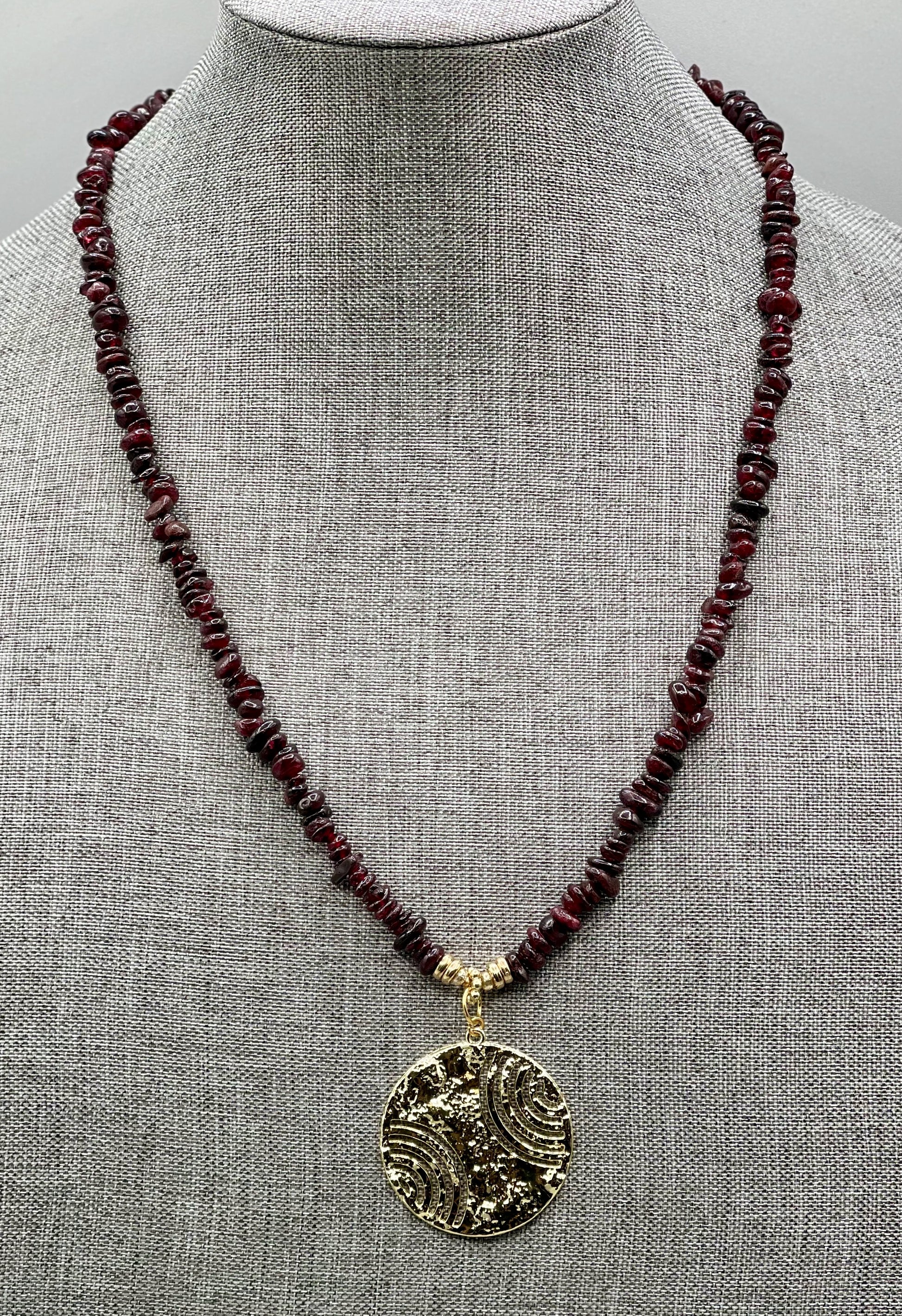 This necklace is supposed to make a statement every time you wear it: It is a striking but stunningly simple 22-inch necklace made of garnet chip beads that is draped off a large medallion that hangs 1 1/2 inches below the bracelet that is attached through gold CCB spacer beads. All necklace closures are composed of a combination of lobster clasp and jump bead findings made with varying combinations of nickel-free zinc alloy, stainless steel, and 925 sterling.