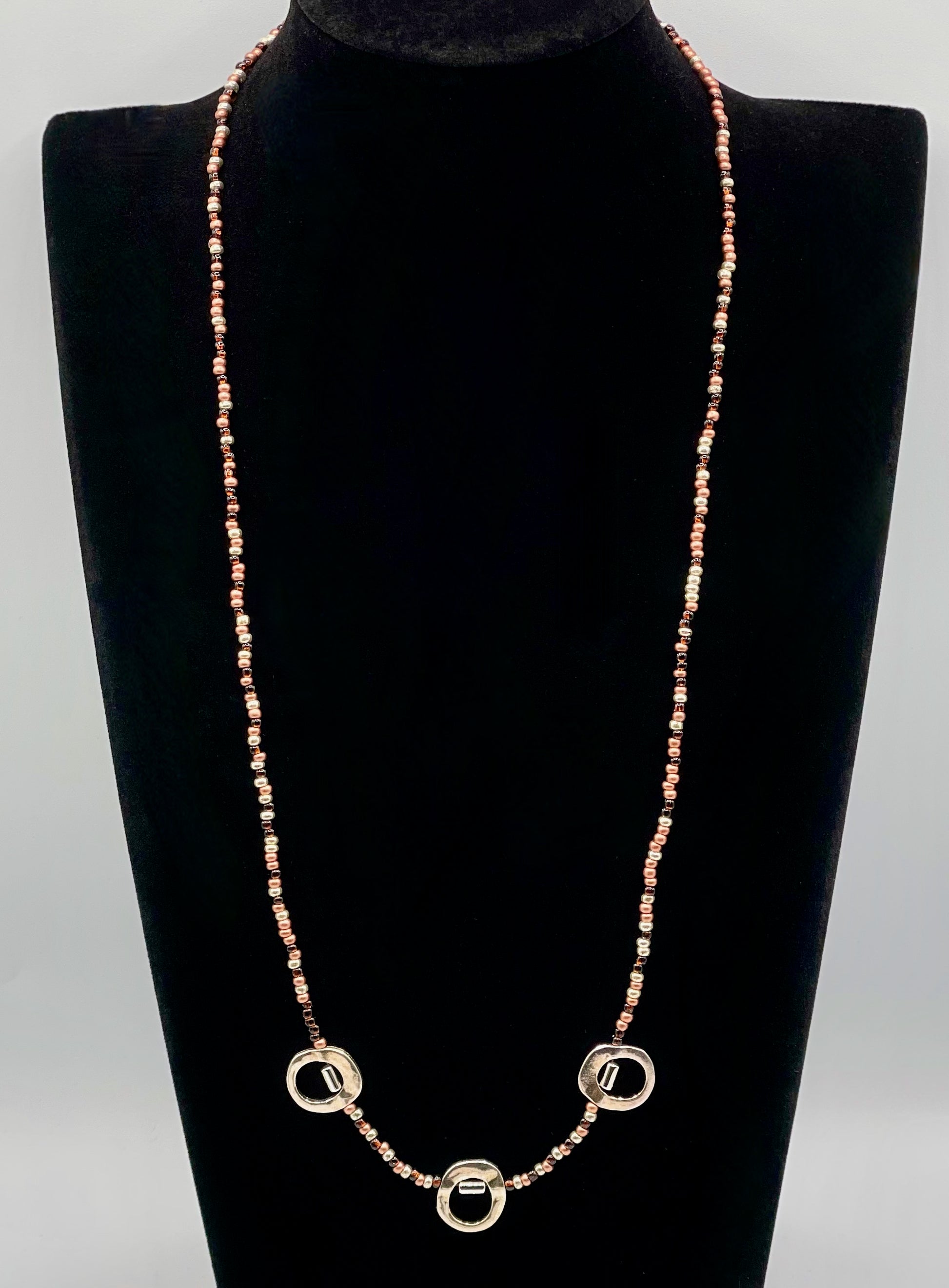 This 25-inch necklace is made of honey, apricot, and silver Czech seed beads enhanced with loop frame beads. All necklace closures are composed of a combination of lobster clasp and jump bead findings made with varying combinations of nickel-free zinc alloy, stainless steel, and 925 sterling.