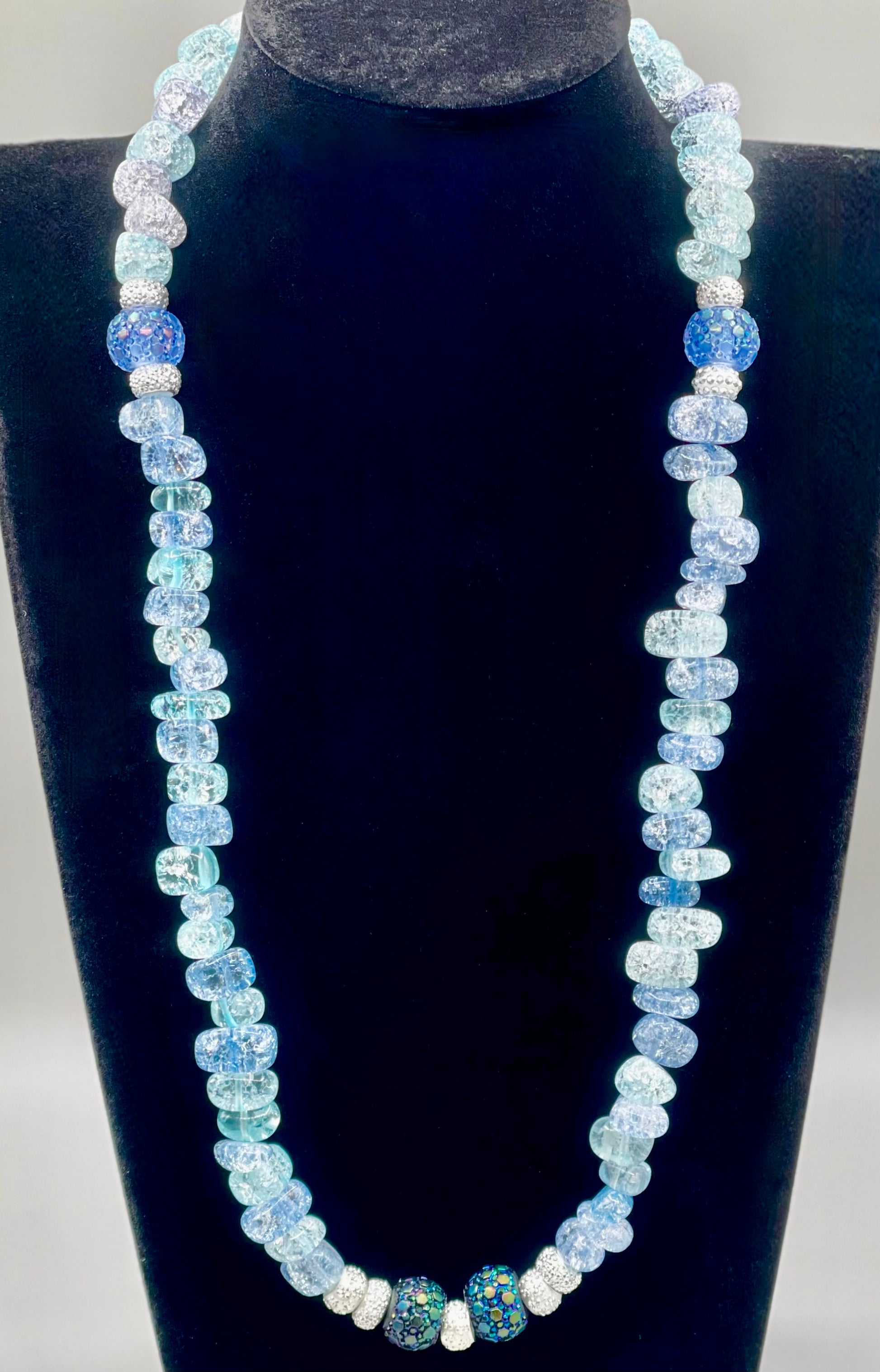 This 30-inch necklace, meant to sparkle in the winter's chill and look cool and refreshing in the summer months, is made of a mix of aqua quartz chip beads. It is accented with medium, dark, and silver acrylic beads to give it an extra touch of flare. All necklace closures are composed of a combination of lobster clasp and jump bead findings made with varying combinations of nickel-free zinc alloy, stainless steel, and 925 sterling.