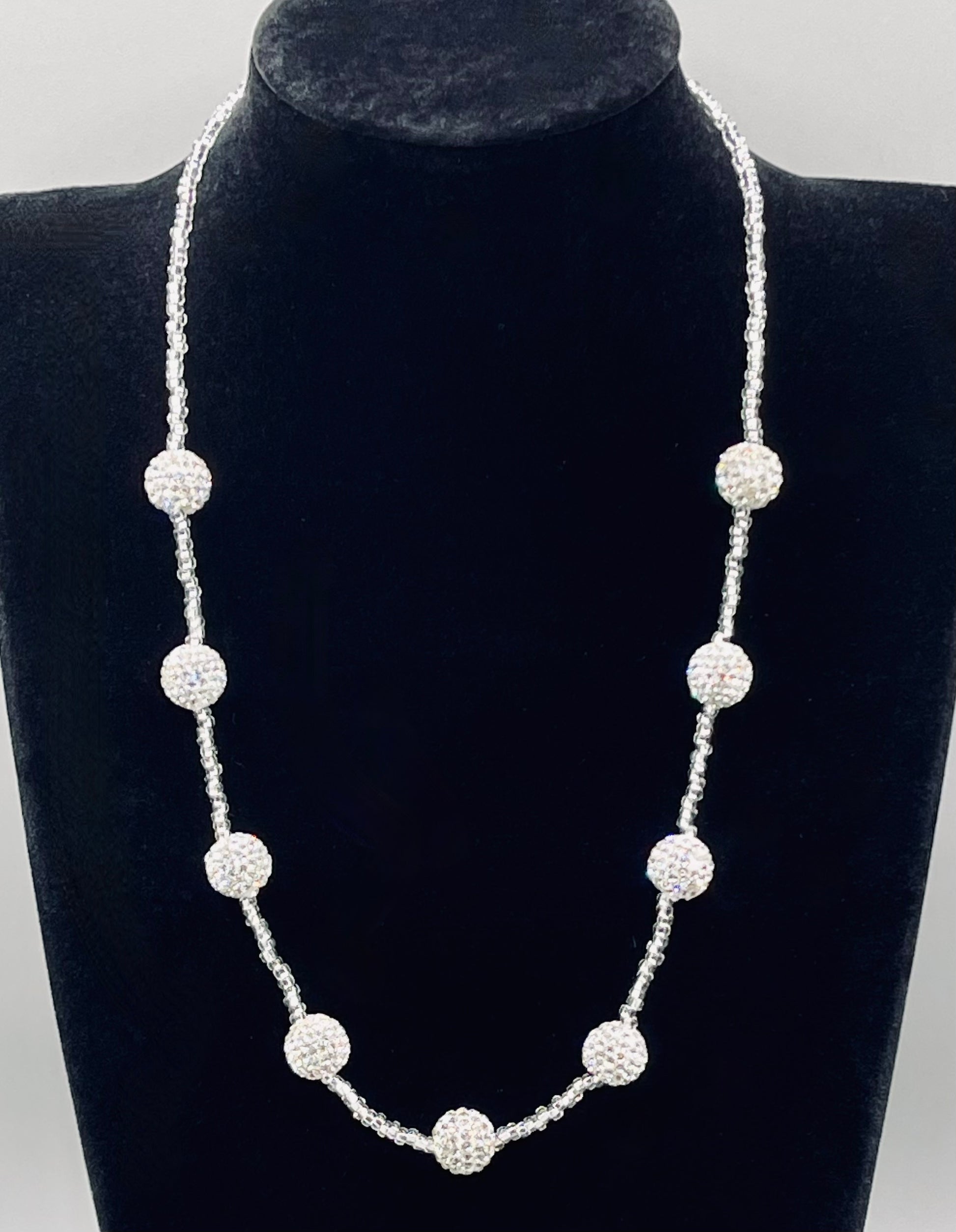 This 21-inch necklace is made of silver rhinestone round beads, strung with a strand of gleaming silver-lined Czech seed beads. All necklace closures are composed of a combination of lobster clasp and jump bead findings made with varying combinations of nickel-free zinc alloy, stainless steel, and 925 sterling.